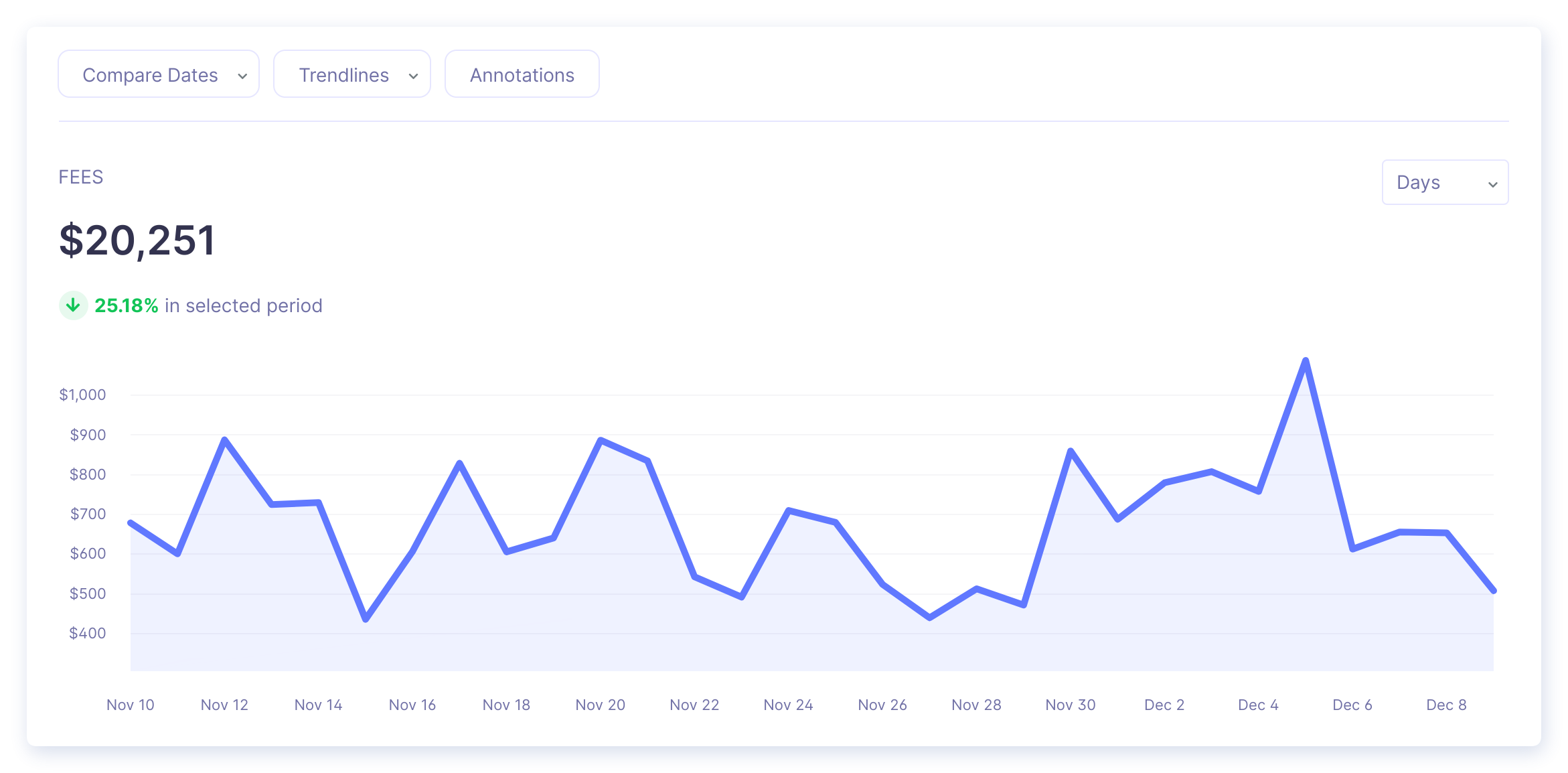 Your Fees metric is updated to show the fees you pay to your payment providers, such as Shopify, Stripe, and the App Store. At this time we do not show fees from Google Play, Chargebee, or Braintree but it is something we're hoping to one day build out!
