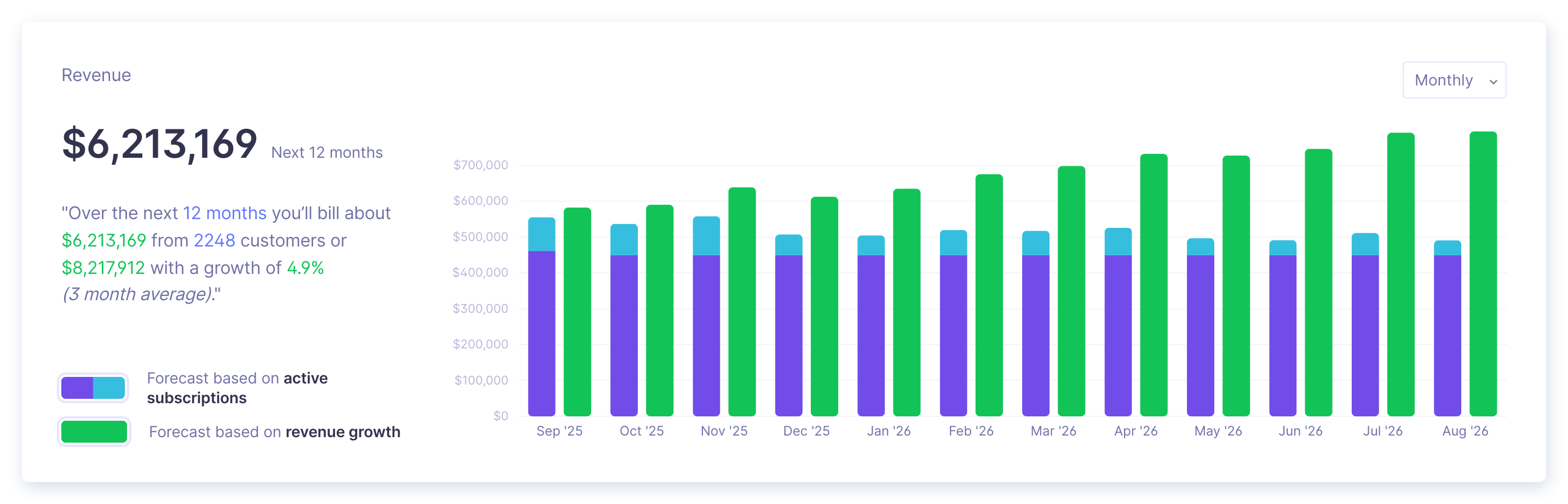 Forecast allows you to project your net revenue, customer count, and MRR over the next year based on your current metrics.