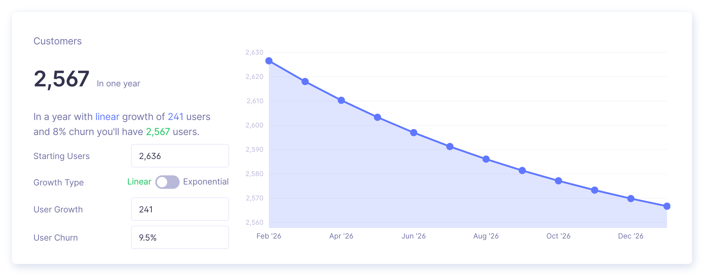 The churn percentage provided is your average user churn rate for the past 3 months. Try lowering your user churn percentage a bit. You'll be surprised at how big of an impact it has on your growth trajectory.
